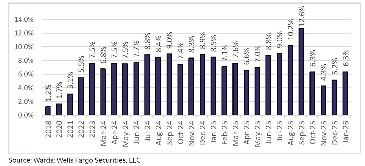 To answer that question I use, courtesy of Colin Langan at Wells Fargo, this chart based on data from Ward’s: