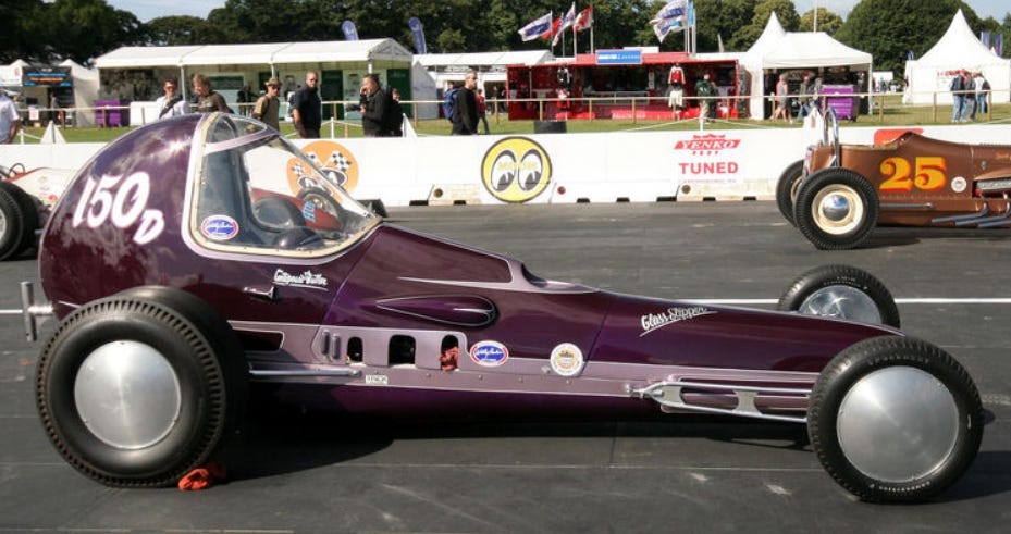 I cannot explain how a kid way back then, sitting around waiting for Dad to invent the plow, or rope, or even just soap, dreamed up what is obviously a 1950s streamliner drag racer1, but he or she did.