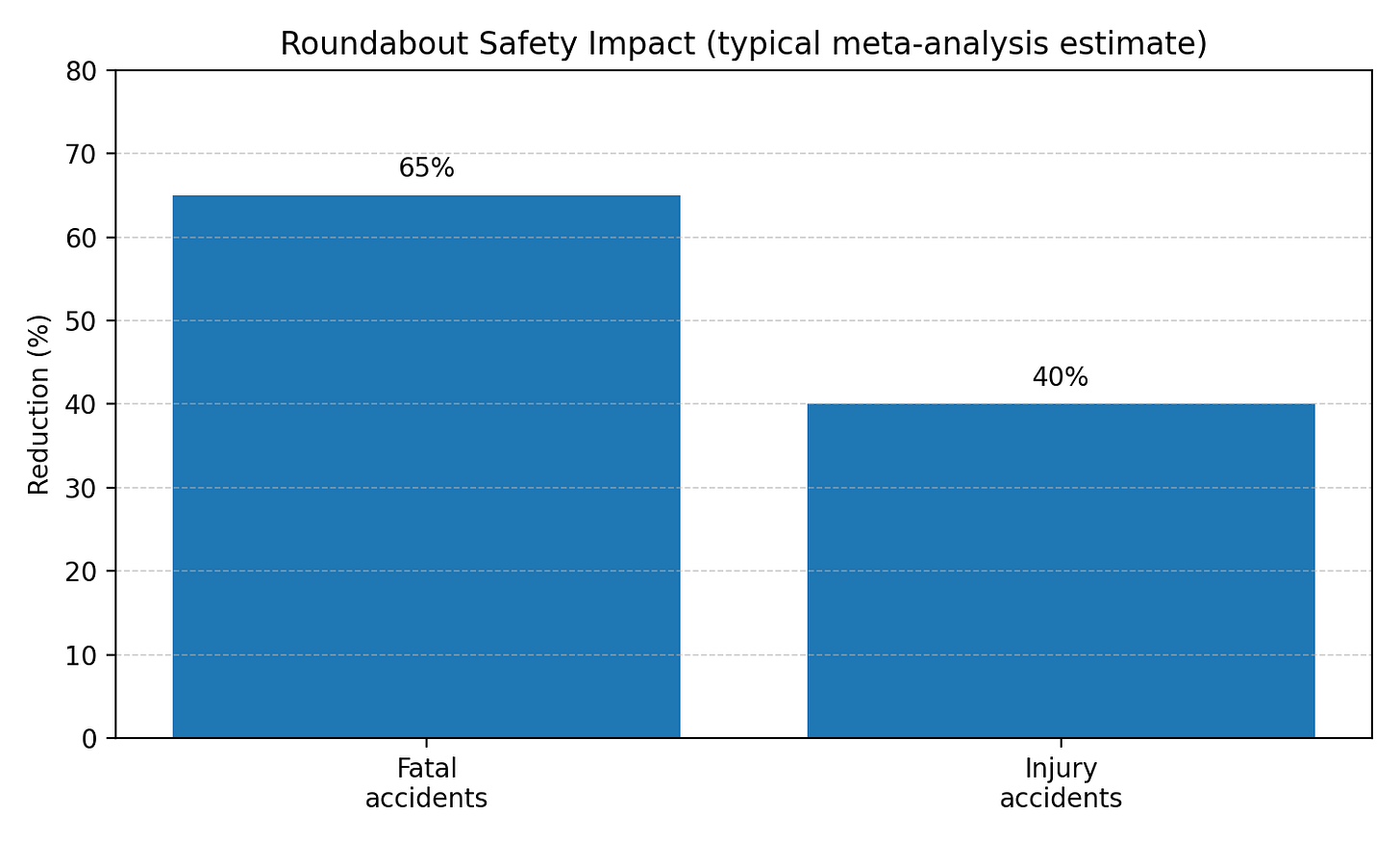 But to cut to the chase, using some very broad assumptions about numbers and types of intersections, my calculations conclude that a nationwide replacement of a majority of traditional intersections with roundabouts - wildly infeasible as it would be - would save perhaps 5,000 lives out of our average 40,000 killed annually on our roads2.
